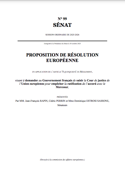 Mercredi 26 novembre dernier, en commission des Affaires étrangères du Sénat, j’ai eu la charge de rapporter sur le projet de résolution européenne, déposé par mes collègues sénateurs Jean-François Rapin, Dominique Estrosi Sassone et Cédric Perrin, qui demande au Gouvernement de saisir la Cour de Justice de l’Union européenne pour empêcher la ratification de l’accord avec le Mercosur.
